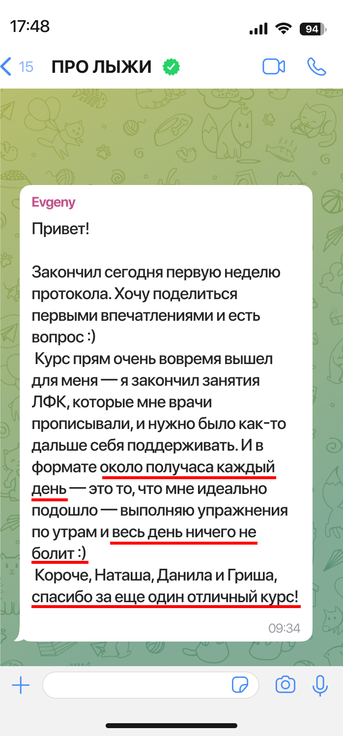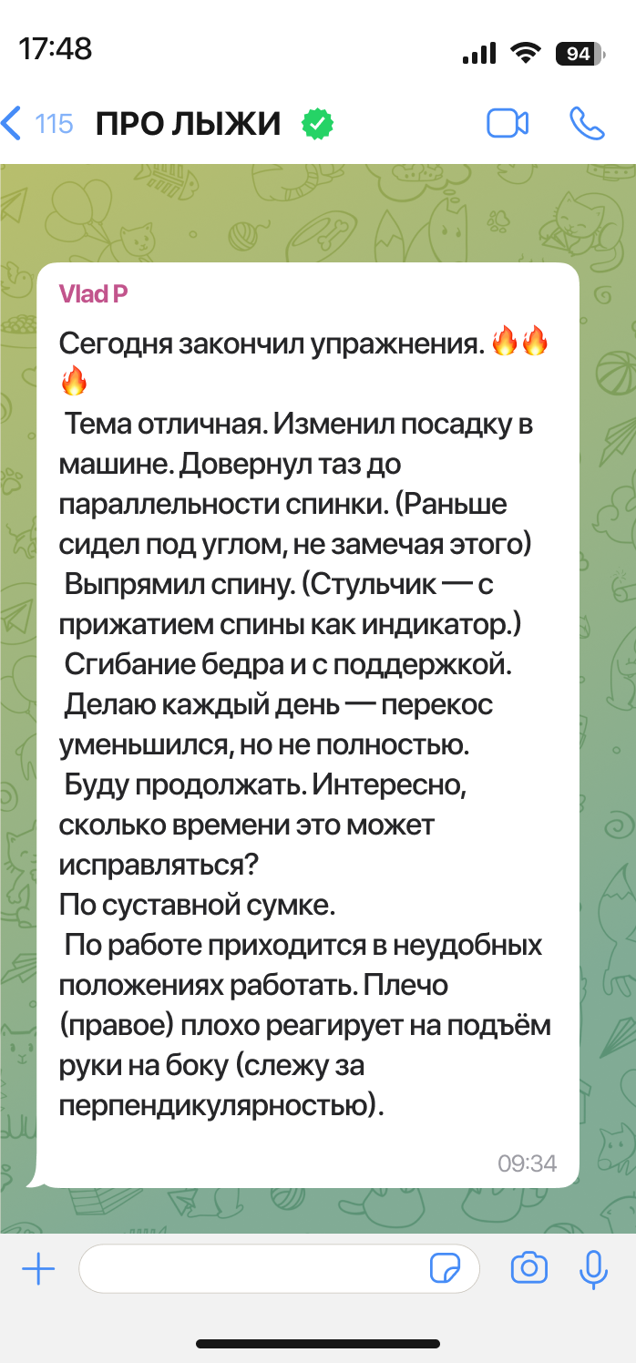Благодаря специально подобранным упражнениям мне удалось быстро восстановиться и даже не пропустить сезон. А боль перестала быть проблемой. Она стала сигналом: пора менять движения.